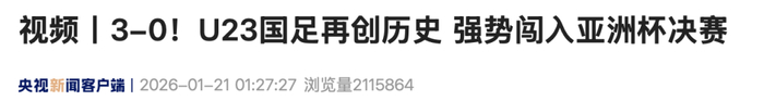 北京时间21日凌晨,U23男足亚洲杯半决赛结束,中国队以3-0战胜越南队,历史首次晋级决赛!