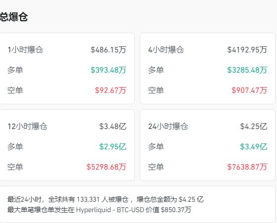 Coinglass数据显示,过去24小时内,加密货币市场共有133,381人被爆仓,爆仓总金额达4.25亿美元(约合人民币30亿元)。