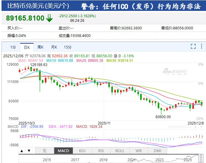 比特币再次跌破9万美元关口,发稿时价格报89165.81美元,跌幅3.16%。