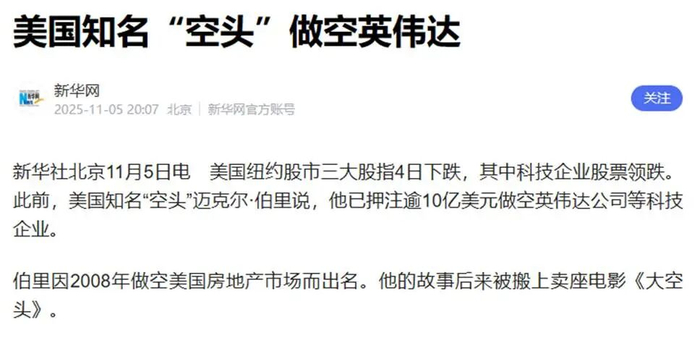 中国证券网:《做空英伟达!“大空头”持仓曝光》
