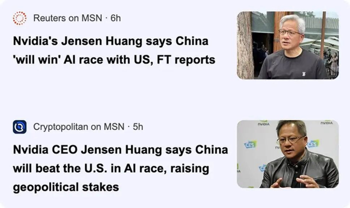 很有意思的是,《大西洋月刊》口中的“英伟达国王”——CEO黄仁勋最近也在表达“担忧”,两周前他在伦敦出席《金融时报》举办的“AI未来峰会”时表示:“中国将赢得人工智能竞赛的胜利。”