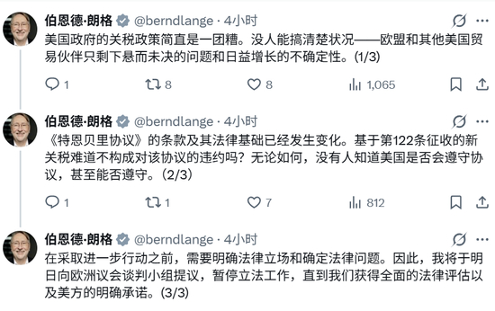 朗格周日在社交媒体上写道:“美国政府方面纯粹是关税混乱。没人能再理解它了——留给欧盟和其他美国贸易伙伴的只有无法回答的问题和不断增长的不确定性。”