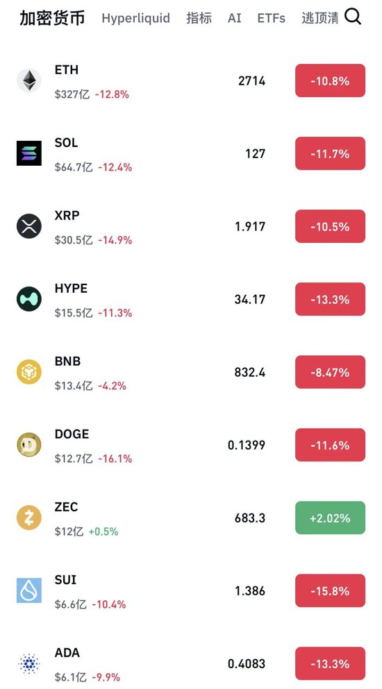 除了比特币,以太坊跌10.8%,SOL币跌11.7%,XRP币跌10.5%,狗狗币跌11.6%,ADA币跌13.3%。