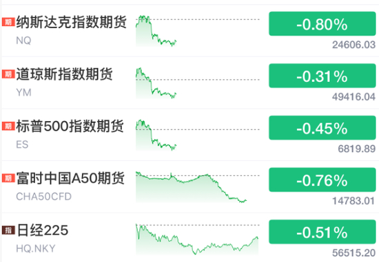 与此同时,美股三大指数期货也全线跳水。纳指跌0.8%,日经225指数跌0.5%,富时中国A50期货指数跌超0.7%。