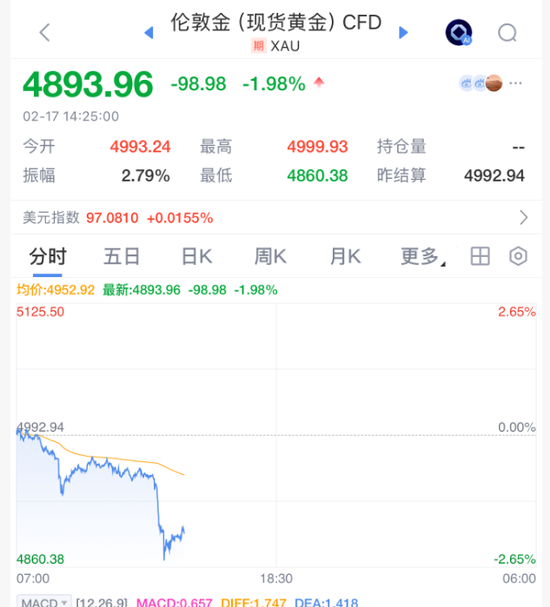 2月17日,现货黄金、白银价格盘中突然大幅跳水,白银一度暴跌约5%,随后跌幅收窄,现货黄金跌破4900美元/盎司。