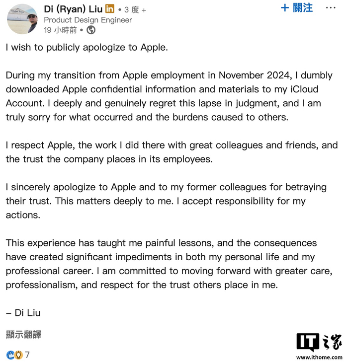 此外,Liu 还通过领英公开道歉,承认自己“错误地下载了苹果公司内部机密资料”,并将此行为称为“判断失误”,表示愿意承担全部责任。他还提到,此次事件已对其个人生活和职业发展造成“重大影响”。事实上,自 2025 年被起诉以来,他也未再在 Snap 任职