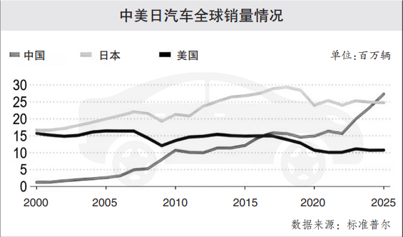 【环球时报记者 杨沙沙 环球时报特约记者 王辉】《日本经济新闻》网站21日报道,在2025年全球新车销量排名中,中国汽车品牌的整体销量超越日本车企,夺得“全球冠军”。中国汽车的全球整体年销量同比增长10%,接近2700万辆;日本车企销量则略有下降,为2500万辆左右。这是自2000年以来,日本汽车行业首次丢掉全球销量第一的宝座。比亚迪、吉利分别在榜单中位列第6和第8位,成为中国品牌的销量冠军与亚军。