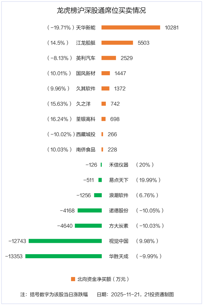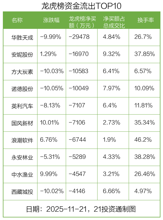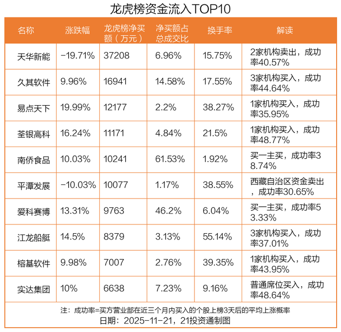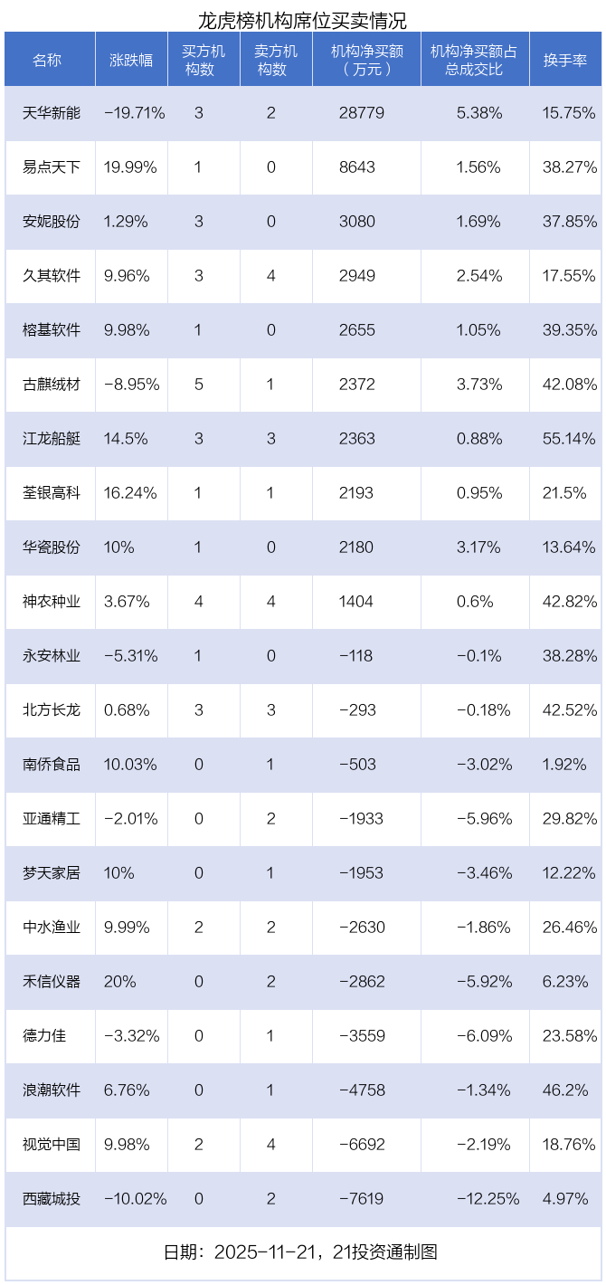 11月21日,上证指数下跌2.45%,深证成指下跌3.41%,创业板指下跌4.02%。盘后龙虎榜数据显示,共有43只个股因当日异动登上龙虎榜,资金净流入最多的是天华新能(300390.SZ),达3.72亿元。