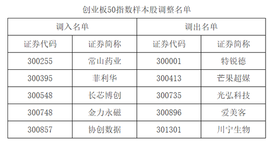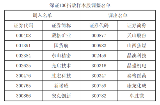 同日,深交所发布《关于调整深证成指、创业板指、深证100、创业板50等指数样本股的公告》,决定于12月15日对深证成指、创业板指、深证100、创业板50等指数实施样本股定期调整。具体来看,深证成指样本股调入深深房A、德明利、国货航、沃尔核材、拓维信息、海能达、奥赛康、四方精创等17只个股,调出国药一致、中国天楹、海德股份、西藏矿业、汉缆股份等17只个股;创业板指数样本股调入双林股份、常山药业、富临精工等8只个股,调出碧水源、易华录、天华新能等8只个股;创业板50指数样本股调入常山药业、菲利华、长芯博创等5只个股,调出特锐德、芒果超媒、光弘科技等5只个股。